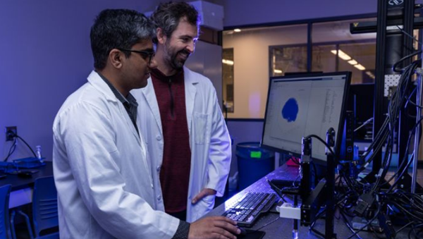 Mujtaba Rafique Ghoto(左)和Christopher O'Bryan正在準備3D打印過程中使用的計算機模型。